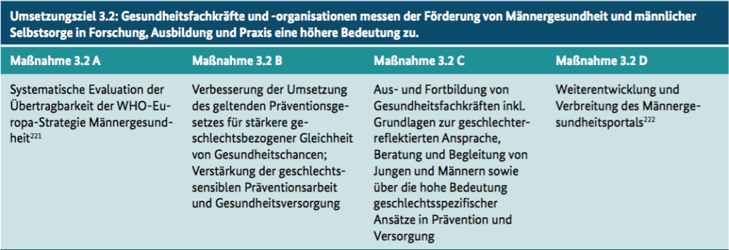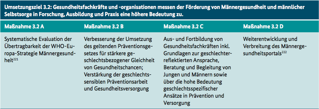 Umsetzungsziel 3.2: Gesundheitsfachpersonen und organisationen messen der Förderung von Männergesundheit und männlicher Selbstsorge in Forschung, Ausbildung und Praxis eine höhere Bedeutung zu. (zum Leitziel Nachhaltigkeit, S. 102)