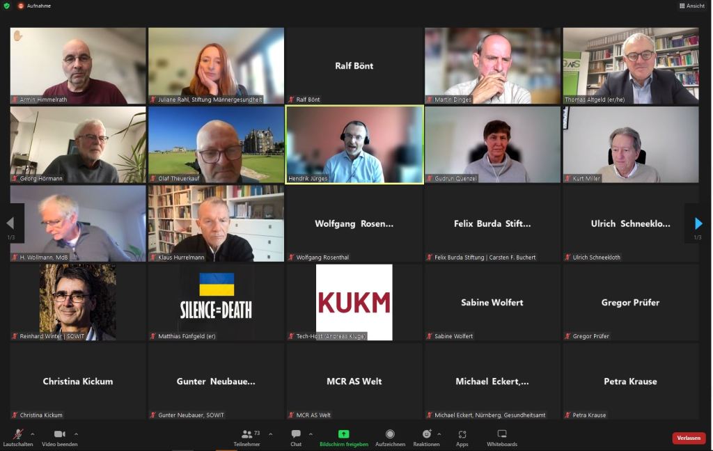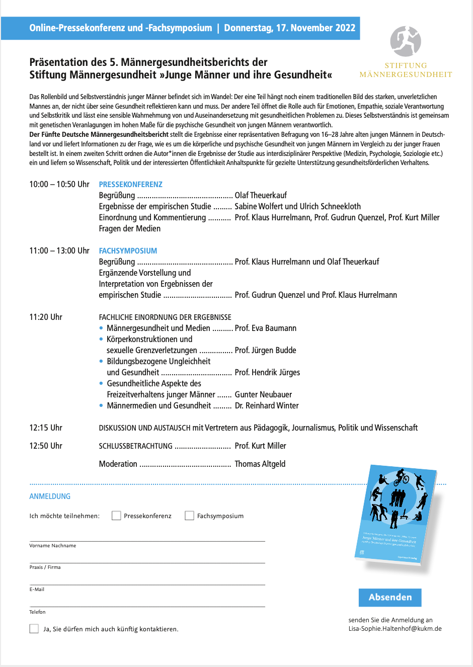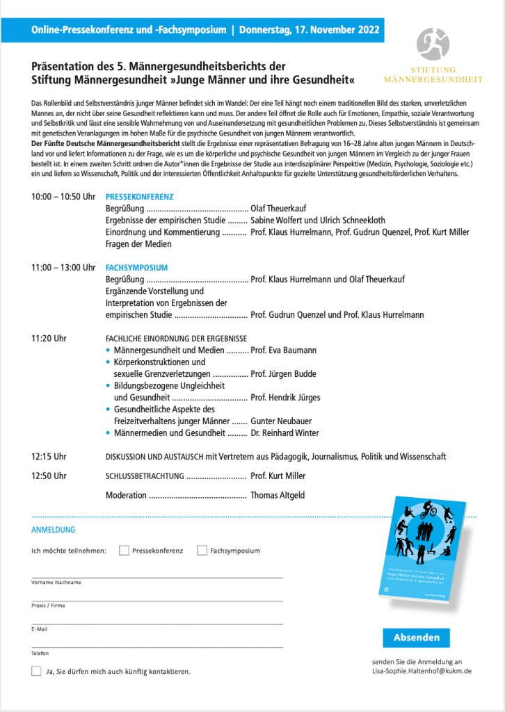 Den Start machte Prof. Kurt Miller, Vorstandsmitglied der Stiftung Männergesundheit, der erste Ergebnisse des im November 2022 erscheinenden Jungengesundheitsberichts der Stiftung präsentierte. Für diesen Bericht wurden in einer eigenen Studie 3.000 Jugendliche und junge Erwachsene im Alter von 16 bis 28 Jahren befragt. Ziel war es, Informationen über das körperliche, psychische und soziale Wohlbefinden, das Gesundheitsverhalten und das soziale Umfeld von jungen Männern im Vergleich zu jungen Frauen zu erhalten.